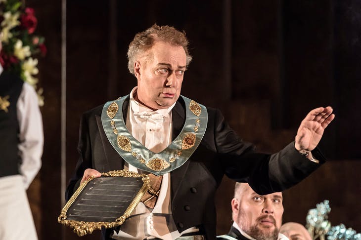 Act One takes place in a London club, not a church as Wagner mistakenly thought. So the opening chorale is a chorus practising, with Hans Sachs — who Wagner scheduled to make his entry half an hour later — monitoring events at the front. The contrast between the sacred atmosphere of the church and the urgency of Walther’s passion for Eva is thus removed. Holten, shocked that women aren’t allowed in some London clubs, has them entering with their husbands the Masters, but then having to leave. All the while there are irrelevant little things going on and distracting from what is anyway a fairly complex storyline, and this fussiness gets ever more pervasive as the opera progresses. The club setting is so elaborate that it has to make do for Act Two as well — which Wagner set in the street between Sachs’s and Pogner’s houses — with no atmosphere at all. The famous elder tree is replaced by a couple of potted plants, and the complicated arrangements with Magdalene at the window mean there is nowhere for the lovers to hide. Enter Beckmesser with his lute, except that he doesn’t have one, but a clavichord is at hand, which he plays. It turns up again conveniently for his attempted prize song in Act Three. It’s hard to tell whether the devastating riot with which the act ends takes place or is a figment of Sachs’s imagination. But anyway it isn’t a riot, just lots of people crowding the stage, and failing to disappear in an instant — one of Wagner’s most brilliant but apparently, for Holten, superfluous inspirations — when the cloven-hoofed Night Watchman appears.