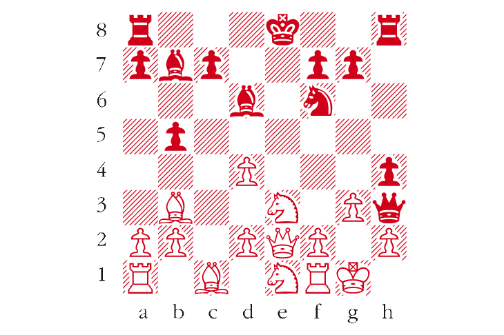 Black to play. This position is from Belsitzman-Rubinstein, Warsaw 1917. How did Rubinstein finish off? Answers to me at The Spectator by Tuesday 2 May or via email to victoria@-spectator.co.uk. There is a prize of £20 for the first correct answer out of a hat. Please include a postal address and allow six weeks for prize delivery.