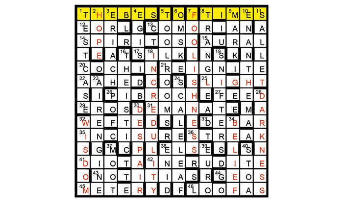 Unclued lights (in red) are the characteristics of ‘the period’, from the opening sentence of A Tale of Two Cities. The highlighted words are part of the same quote, appropriately occupying the first line of the grid.