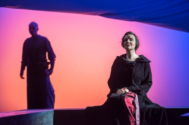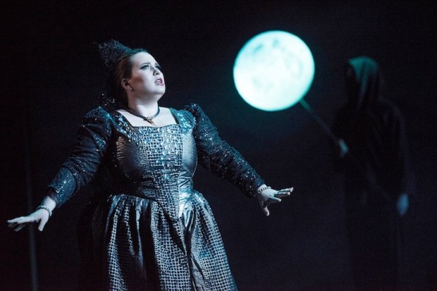 We see the married couples processing through the arch of balloons, Aida-style, as the opening music is played. Naturally, one of the daughters, Hipermestra, falls in love with her bridegroom Linceo, launching the three hours that follow. Complicated action ensues. In due course, Danao is murdered, and Hipermestra gets so desperate that her husband has fallen for someone else that she hurls herself off a rock, but is caught by a passing peacock — ‘moments of grace do happen’, Vick assures us in the programme. It could be a nice idea for a fresh production of Tosca, with the heroine rescued from Scarpia’s henchmen.