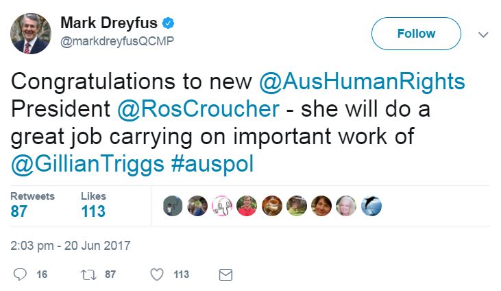Croucher, who is the outgoing head of the Australian Law Reform Commission, is Triggs-lite. One need only read this 3 March 2016 article in The Australian authored by Croucher herself to see why. In the article – littered with references to international law – Croucher identifies the constitutional vulnerability of section 18C’s prohibition of speech or acts that ‘offend’ because of a person’s race. Accompanying this observation is the note that not only are racial vilification laws are needed, and that “there might be a need for new criminal laws to target the most serious types of racial vilification.” Croucher concludes the article by contemplating extending 18C to other areas by noting how the ALRC’s work can “complement work that considers other ways to protect rights – such as by creating new causes of action or new offences, or by enacting a bill of rights.”