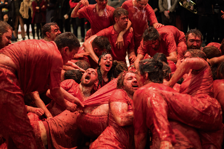 We are a third of the way through a three and a half hour performance by Hermann Nitsch that can only be described as a marathon of the dark arts. The Austrian artist is in Hobart to direct his 150th Orgien Mysterien Theater (Theatre of Orgies and Mysteries), otherwise known as ‘actions’, for MONA’s Dark Mofo festival. A sacrificial ritual involving 500 litres of blood, a bull carcass, and – later – lots of lithe bodies squirming in entrails, it is graphic and explicit, a ceremony that requires complete surrender to the senses.