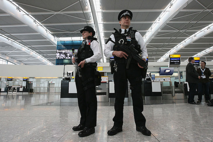 Contrast, then, these highly disciplined men with the armed pair I saw recently patrolling the floor of the departures lounge at Bristol airport. One had a comic, fall-guy, laughter-prone face, as characterful and funny to look at as George Formby’s. His boon companion looked like a great fellow to sink a few pints of cooking lager with, then go to a football match. One of them — hard to say which — had made a witticism and they were patrolling lopsidededly, corpsing with laughter. In the soullessness and anxiety of a British departure lounge, their intimacy and unaffected mirth was a kind of innocent rebuke.