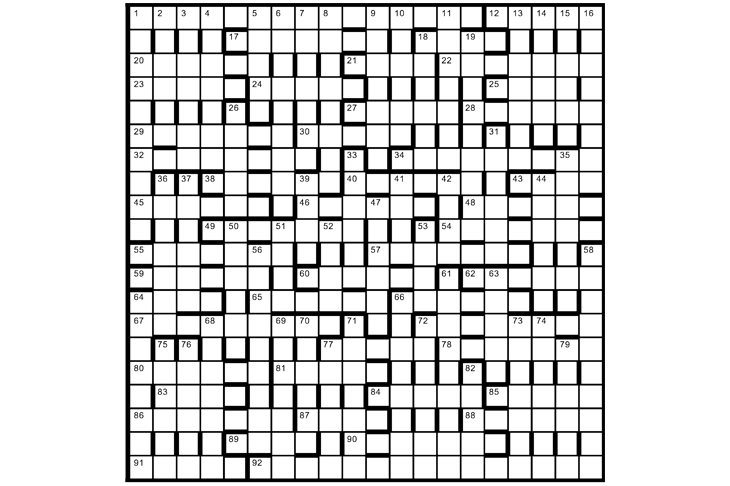 Three unclued lights form a nine-word quotation from a thematic work. Remaining unclued lights, including one hyphened, are five trios of words of a kind, each suggested by a thematic word from the same work. Three further thematic words need highlighting in the completed grid.