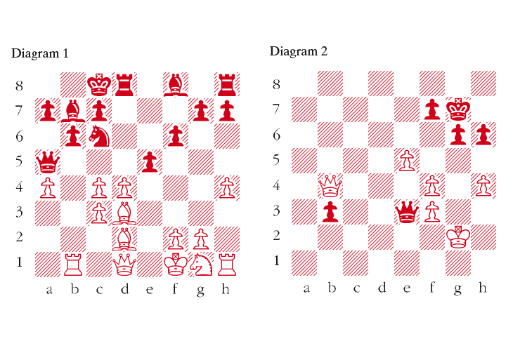 White’s next move creates huge complications. 15 c5 Bxc5 This move, exploiting the pin along the d-file, is essentially forced. 16 Rb5 Qa6 17 Rh3 White protects the d3-bishop with a view to unleashing a deadly discovered attack by the rook on b5. Black now takes drastic action. 17 … Bxd4 18 Be2 18 cxd4 Rxd4 19 Ne2 Qxa4 is good for Black. 18 … Rd6 This is a mistake. Black should play 18 … Ba8 to create a flight square for the queen on b7. 19 Rb1 Much better is 19 Rb2, to protect the bishop on d2. After 19 … Qa5 20 cxd4 Qd5 21 dxe5 Nxe5 22 Nf3 White is a piece ahead although the situation remains complex. 19 … Qa5 20 Rb5 Qa6 Black could try 20 … Bxc3 which leads to the following extraordinary variation: 21 Rd3 Rxd3 22 Bxd3 Ba6 (22 … Bxd2 is also possible) 23 Bxc3 Qxc3 24 Ne2 Qa3 25 Rb3 Qxa4 26 Bf5+ Kb8 27 Rxb6+ cxb6 28 Qxa4 Bxe2+ 29 Kxe2 Nd4+ 30 Kd3 Nxf5 31 Qd7 and White stands better. 21 Rb1 Qa5 22 Rb5 Draw agreed