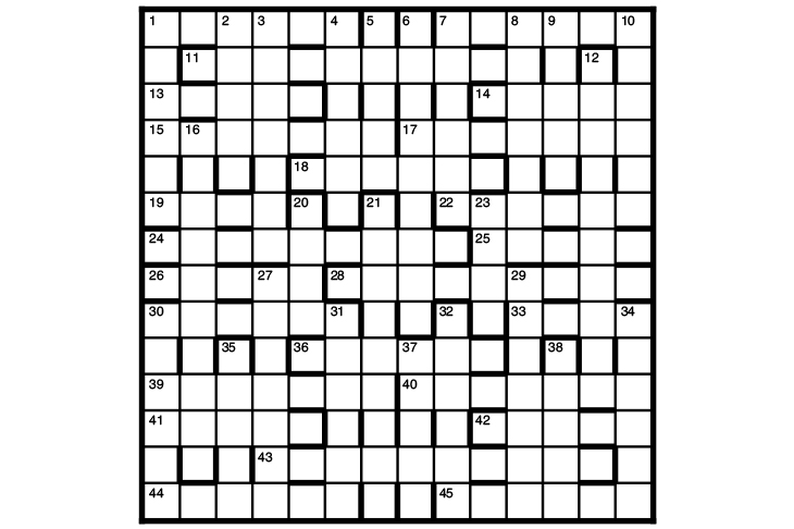 A first prize of £30 for the first correct solution opened on 23 April. There are two runners-up prizes of £20. (UK solvers can choose to receive the latest edition of the Chambers dictionary instead of cash — ring the word ‘dictionary’.) Entries to: Crossword 2353, The Spectator, 22 Old Queen Street, London SW1H 9HP. Please allow six weeks for prize delivery.
