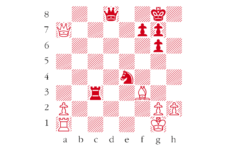 Black to play. This position is from Bluebaum-Vitiugov, Grenke 2018. Can you spot Black’s amazing winning move? Answers to me at The Spectator by Tuesday 1 May or via email to victoria@spectator.co.uk. There is a prize of £20 for the first correct answer out of a hat. Please include a postal address and allow six weeks for prize delivery.