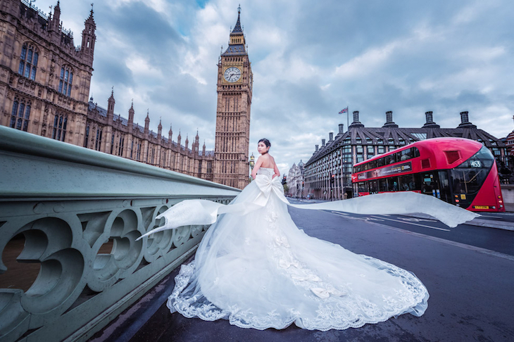 If you’ve walked by the red telephone boxes on Parliament Square, chances are you have seen an Asian couple in full wedding dress posing for a photographer. A strange place to go after a wedding, you might think, but the odds are that they’re not (yet) married — and won’t be for some time. This is, instead, a new Chinese phenomenon: the pre-wedding photo shoot.