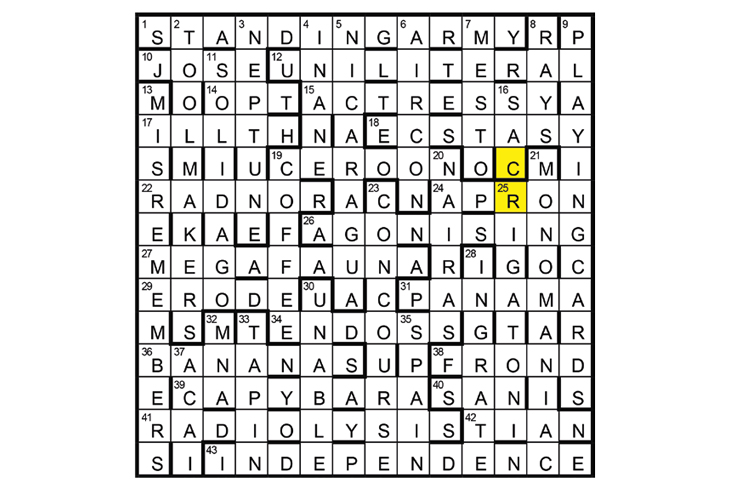 On 15 September, Costa Rica, bordered by PANAMA (31) and NICARAGUA (5), and whose capital is SAN JOSÉ (40/10), celebrated its INDEPENDENCE (43) from SPAIN (35). Its main exports are BANANAS (36) and COFFEE (19D) and, unusually, it has no STANDING ARMY (1). CR (in the twelfth column) was to be shaded.