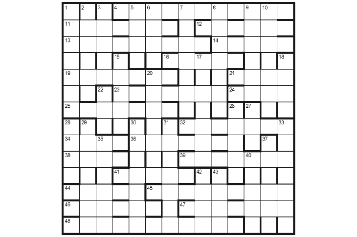The theme is two historic people who were contemporaries. Unclued lights give their forenames, places of birth and death and occupations. A geographical feature (5) linking the two will appear in the completed grid and must be shaded. Elsewhere, ignore an apostrophe. The solutions at 22 and 27 share the same two unchecked letters.