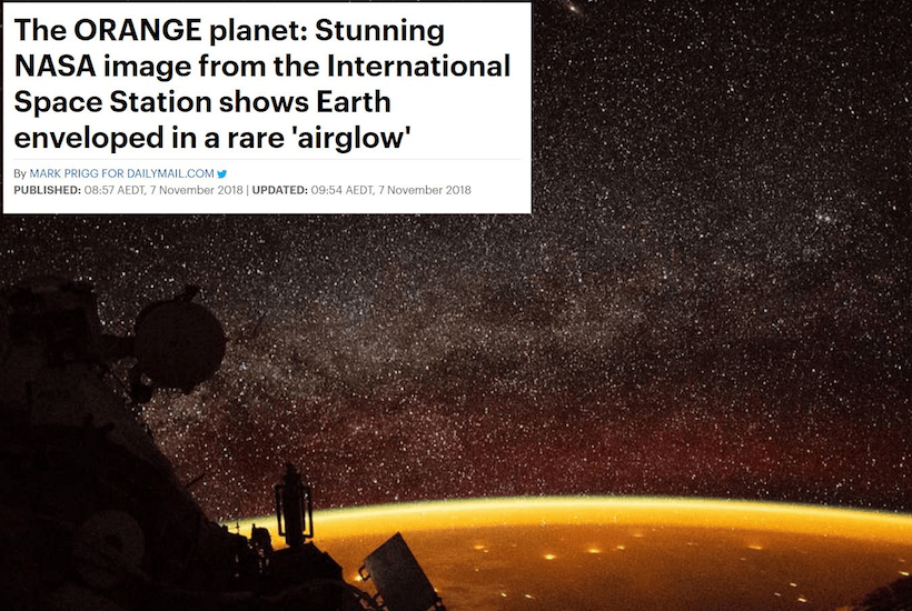 ‘The orange hue enveloping Earth is known as airglow, a diffuse bands of light that stretch 50 to 400 miles into our atmosphere,’ NASA explained.