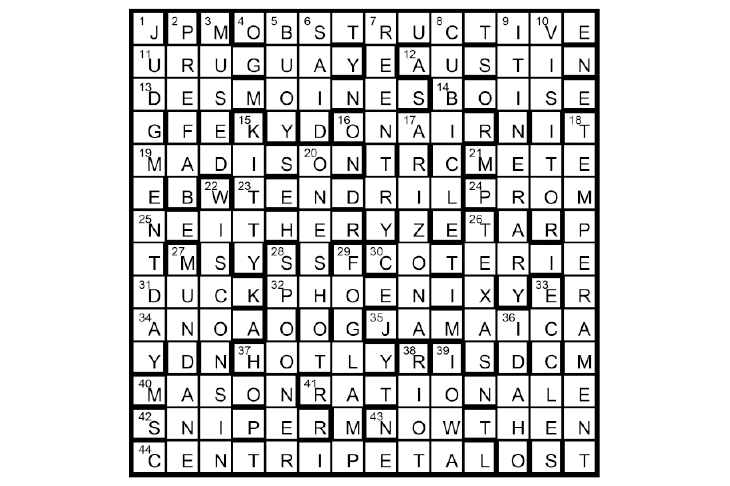 The unclued Across lights are US state capitals and the unclued Down ones are the states. The title refers to DELAWARE (DE) and its capital DOVER.