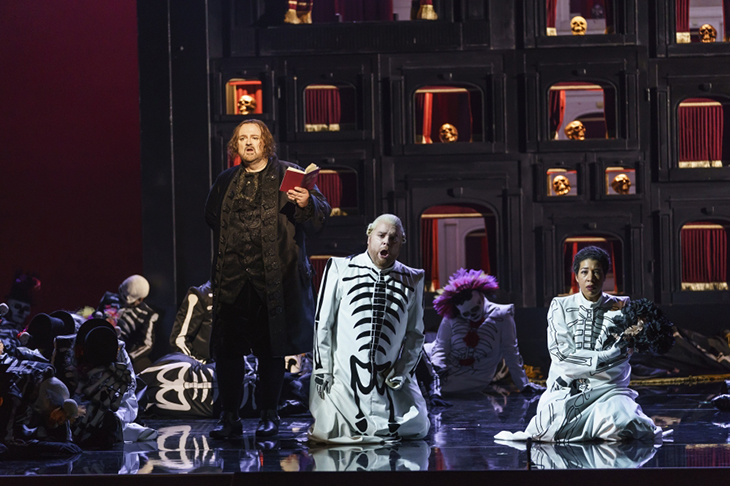 David Pountney, as director, scrolls through a series of gloomy tableaux which — with costume styles ranging from Adam Ant to voodoo carnival — look terrific without always helping to tell the story. Then he fluffs the assassination scene, with a tricksy framing device that splits Riccardo into two separate characters. Read the programme essays and you’ll probably get it: doppelgängers, the Gothick, that sort of thing. ‘So, what actually happened?’ asked my companion, who’d mistakenly assumed that the action on stage would tell her everything she needed to know.