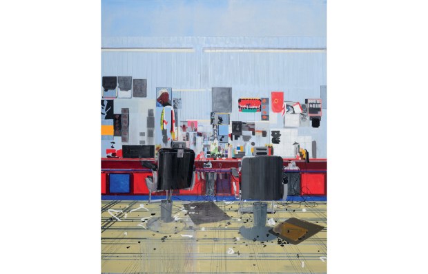 In the adjoining space, young artist Nick Goss has been given his first museum show. Another painter with a self-confessed ‘eye for tawdry detail’, Goss spreads his paint more thinly than Gilman over 7ft canvases, using turpsy washes interrupted by patches of silkscreen. The south London fast food restaurant in ‘Morley’s Mirror’ (2018) is the contemporary equivalent of Gilman’s ‘Eating House’, with the tawdry detail of a laminated menu featuring a monstrous burger oozing Day-Glo ketchup. But Goss’s urban reality is steeped, even flooded, in post-apocalyptic fantasy. The allegory in these collage-like images of a reimagined London feels like an add-on: it’s nothing personal, just picture-making.
