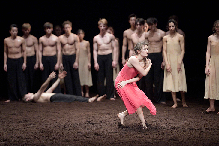 During the second interval, a team of techies wheel bins of earth on to the stage. They tip and rake and shovel the peat to smoothness. The first bars of Stravinsky’s Rite of Spring fill the dimness, shivering every vertebra. The late Pina Bausch’s rendering of the Rite of Spring, first danced in 1975, is electrifying. Josephine Ann Endicott, one of the original company, has said: ‘If you are not exhausted at the end, truly exhausted, then you haven’t danced it properly.’ Exhausted? They’d been through a war.