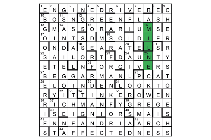 The unclued lights form the folk rhyme ‘Tinker, tailor, soldier, sailor, rich man, poor man, beggar-man, thief’. A.A. Milne (MILNE had to be highlighted) used this as the basis for Cherry-Stones, (9d) though the beggar-man became a ploughboy. Milne’s next five jobs are also mentioned in various clues.