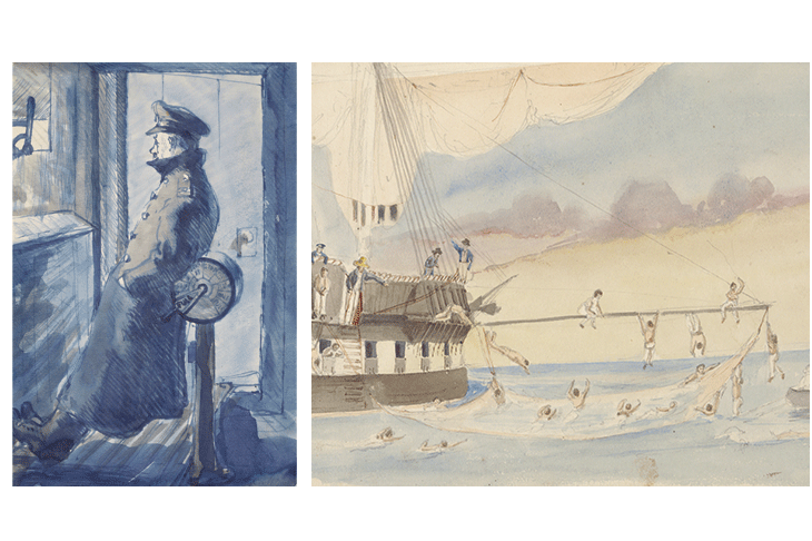 Trained at the Royal Academy Schools in the 1930s, he was about to take up a post at Edinburgh College of Art when war broke out and he instead went to sea. After a spell on convoy duty he was sunk while on an operation to relieve Malta, washed ashore on the Algerian coast and taken prisoner of war until liberated in 1942, when he rejoined the service until the end of the war. His ink sketches, made on the back of bits of old navigational charts, are not just evocative vignettes of life at sea but evidence of a real artist — three brilliantly economic studies of the 2nd Engineer cutting the Chief’s hair are particularly memorable.