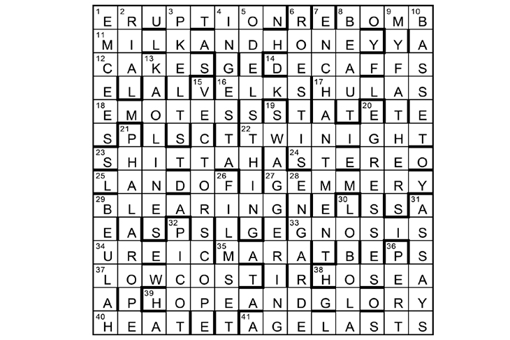 The unclued lights are LAND OF (25A): MILK AND HONEY (11A), CAKES (12A), HOPE AND GLORY (39A), ENCHANTMENT (7D), MY FATHERS (9D) and BEULAH (29D).