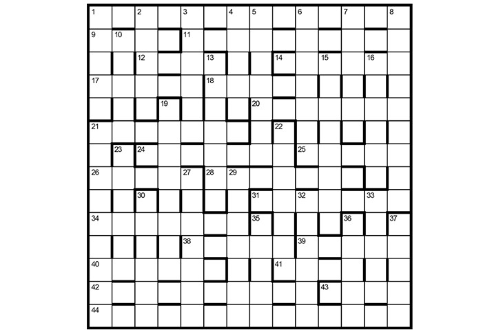1A (four words) and 44 (four words) are quotations from the first verse of a poem (in ODQ). Five remaining unclued lights are examples of 1A, while 44 might be a comment on the other four. The poet’s initials will appear upwards in the completed grid and must be shaded.