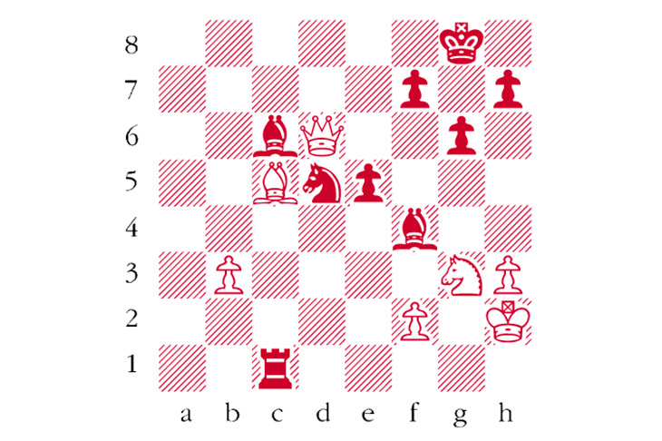 Black to play. This is from Carlsen-Ding, St Louis 2019. The black pieces are converging on the white king but he must deal with the threat of Qf8 mate. How did he do this while bringing his own attack to a conclusion? Answers to me at The Spectator by Tuesday 10 September or via email to victoria@spectator.co.uk. There is a prize of £20 for the first correct answer out of a hat. Please include a postal address and allow six weeks for prize delivery.