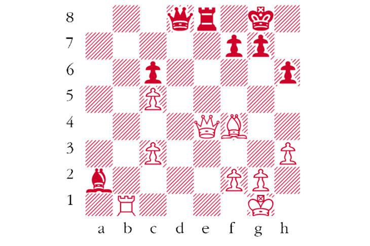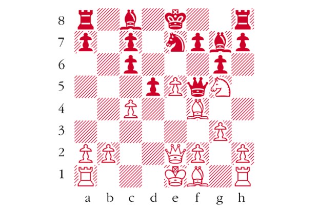 White to play. This is from Nguyen-Alekseenko, Khanty-Mansiysk 2019. White’s queen and rook are both attacked. How does he maintain material parity? Answers to me at The Spectator by Tuesday 24 September or via email to victoria@spectator.co.uk. There is a prize of £20 for the first correct answer out of a hat. Please include a postal address and allow six weeks for prize delivery.