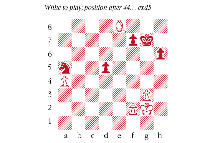 1 Nf3 Nf6 2 c4 c5 3 Nc3 d5 4 cxd5 Nxd5 5 e3 e6 6 Bc4 Be7 7 O-O O-O 8 Qe2 Nc6 9 Rd1 b6 10 d4 Nxc3 11 bxc3 Qc7 12 e4 Rd8 13 Be3 Na5 14 Bd3 Bb7 15 h4 b5 16 Bxb5 Bxe4 17 dxc5 Bxf3 18 Qxf3 Bxc5 19 Bf4 Qb7 20 Qe2 Qe7 21 h5 Bd6 22 Bxd6 Rxd6 23 Rxd6 Qxd6 24 Rd1 Qc5 25 Rd7 Qxc3 26 Qd1 h6 27 g3 Rf8 28 Rxa7 Nc6 29 Rd7 Ne5 30 Rd8 Qc7 31 Rxf8+ Kxf8 32 a4 Ke7 33 Be2 Qc3 34 Qb1 Nc6 35 Qb7+ Kf6 36 Bf1 Na5 37 Qd7 g5 38 hxg6 Kxg6 39 Kg2 Kg7 40 Bb5 Qe5 41 Qd3 Qc5 42 Qf3 Qd4 43 Be8 Qd5 44 Qxd5 exd5 (see diagram) 45 Kf3 Kf6 46 Kg4 46 Ke3 Ke7 47 Bb5 Kd6 48 Kd4 f6 49 Kc3 Kc5 leaves no way forward. 46… Ke7 47 Bb5 Kf6 48 Kh5 Kg7 49 Bf1 Nb3 50 Bg2 d4 51 Bf1 Nd2 52 Bd3 Nb3 53 Bf1 Nd2 54 Bd3 Nb3 55 Bb5 f6 56 Bf1 Na5 57 Ba6 Nb3 58 Bb5 Na5 At last, everything is ready! 59 Kg4! Nb7 60 Kf4 Nc5 61 a5 d3 62 Ke3 d2 63 Be2 Be2-d1 will follow, to prevent the fork on b3, then Ke3xd2 so Black resigns.
