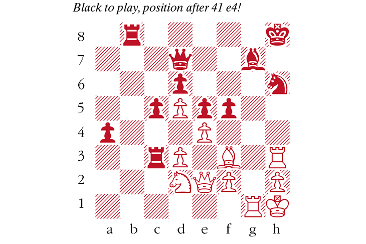 1 c4 c5 2 g3 g6 3 Bg2 Bg7 4 Nc3 Nc6 5 Nf3 e5 6 O-O Nge7 7 d3 d6 8 a3 a5 9 Rb1 O-O 10 b3 Rb8 11 Bb2 h6 12 Nd2 Be6 13 Nd5 b5 14 e3 Qd7 15 Re1 Bg4 16 Qc2 Rfc8 17 Ne4 A clever idea, threatening a fork on f6 to encourage the exchange on d5. 17…Nxd5 18 cxd5 Ne7 19 Nd2 Bh3 20 Bh1 Nf5 21 a4 Carving out a weakness in Black’s queenside. 21…h5 22 axb5 Rxb5 23 Ra1 h4 24 Bc3 Ra8 25 Ra4 Qd8 26 Bf3 Rab8 27 Rea1 Bh6 28 Re1 The rook returns to prevent a piece sacrifice on e3. White’s setup is so robust that there is no way to exploit this loss of time. 28 …Qg5 29 Ne4 Qd8 30 Ra3 Ne7 31 Nd2 Nf5 32 Qd1 A deep decision. Ding could have played 32 Nc4 and grabbed the pawn on a5. But first he shores up the kingside. 32 …Bg7 33 g4 Nh6 34 Kh1 f5 35 gxf5 gxf5 36 Rg1 Qd7 37 Qe2 Kh8 38 Ra4 A surprising switch. This rook is bound for the kingside! 38…Rxb3 38… Ng4 39 e4! undermines the knight’s defence. 39 Rxh4 Rxc3 40 Rxh3 a4 41 e4! (see diagram) I love this powerful little move, staking a claim to the kingside light squares. 41…Rc2 41… fxe4 42 Bg4! is an important intermezzo. 42 Rh5 f4 42…Rbb2 43 exf5! Rxd2 44 Qe3 and 45 Rxh6+ is unstoppable. 43 Qd1 Rbb2 44 Nc4 a3 45 Bg4 Qd8 46 Nxb2 Rxb2 47 Be6 a2 48 Rxg7! Accurately calculated. 48… Kxg7 Another pretty finish would be 48…Rb1 49 Rg1! Qf8 (to defend h6) 50 Qg4 a1=Q 51 Rxh6+ Qxh6 52 Qg8 mate. 49 Qg1+ Kf8 50 Rf5+ Black resigns 50…Nxf5 51 Qg8+ and mate follows.