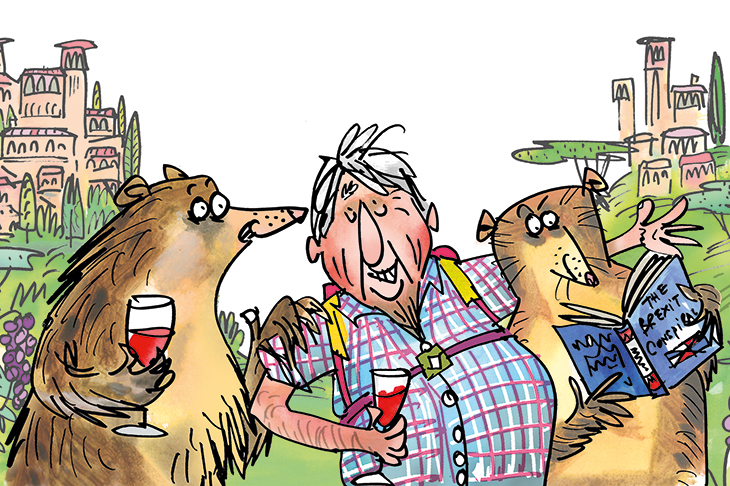 ‘Oh yes. In 2015 the World Wildlife Fund held a big ceremony in Brussels to celebrate 25 years of EU legislation on nature protection, and — because I’d pushed through much of this legislation when I worked for the European Commission — I was awarded the “World Wildlife Fund Leader of the Living Planet” award. Can you imagine? You can arise and be carried up to heaven on the strength of that! So that was the second one. The third — I’ve only got four — was in Berlin in l998. A novel I wrote called The Commissioner was made into a film and shown at the Berlin Film Festival and at the end the audience applauded and shouted out “Author! Author!” And number four — I lasted a long time on I’m a Celebrity… Get Me Out of Here!, and either Ant or Dec said nine million people had voted for me to be prime minister of Downing Creek! So those are the four achievements I’m proudest of.’