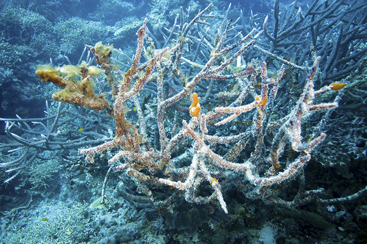 One Saudi fertiliser plant flushes 5.8 million cubic metres of water poisoned with ammonia and heavy metals into the sea every year. The Saudi city of Al Khobar expels ten million cubic metres of raw sewage into the gulf annually. In Bonaire, a Caribbean island off the coast of Venezuela, Roberts finds a massive wipe-out of the coral, up to 99 per cent. The culprit: human gut bacteria ‘from sewage sloshed into the sea’. Fertilisers and spillage from land developments and the overfishing of grazing fish cause seaweed to explode, smothering reefs and boosting the numbers of Crown of Thorns starfish, who feast on coral’s corpses like looters after a massacre.