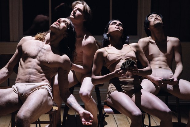 Deluxe introduces new work from three experimental female choreographers, including Maxine Doyle, who twists some dark lyrics by the poet Kate Tempest into a stylish saga about a night owl named Bradley. The Boyz take turns channelling different incarnations of this enigmatic bruiser, who sports a crumpled suit and a black eye: Bradley as a lush, staggering through a sea of jazz hands; Bradley in paranoia mode, rattling off panicked monologues about dinner. Liam Riddick’s goth spin is a highlight, a fever dream of black lipstick and groovy strutting. Cassie Kinoshi’s brass-heavy score glints with élan, spicing up the mood even as the grind turns dark.