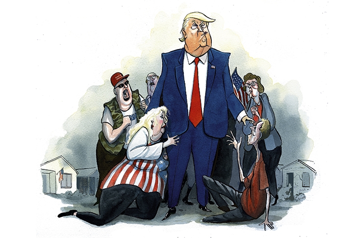 I’m afraid this is where the joke must end. Trump’s modus operandi is to get, not give. He is a walking appetite. He likes cheap labour when it works for him, like the illegal Poles employed at his construction sites in the 1980s and, more recently, the undocumented Latinos who toiled in his clubs and hotels. If he really wanted to help working people hurt by the North American Free Trade Agreement, he would have broken with what he still calls the ‘stupid Republicans’ and allied himself with Democrats to promote an increased minimum wage and a public works programme. Instead of attacking Amazon’s Jeff Bezos with words, he would have pushed his Justice Department harder to attack the billionaire chiseller and monopolist in court. And he would have brought the troops — none of them wealthy draft dodgers like Trump himself — home from Afghanistan and Iraq. The self-pitying Trump lacks guts, not just principles.