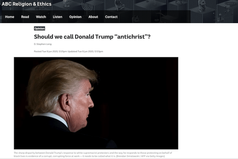 Don’t just jot it in your diary. Mark it in the annals of history; the day the ABC once and for all jumped the shark. June 9, 2020, the day the national broadcaster published a lurid theological acid trip disguised as intellectual endeavour, “Should we call Donald Trump antichrist?”