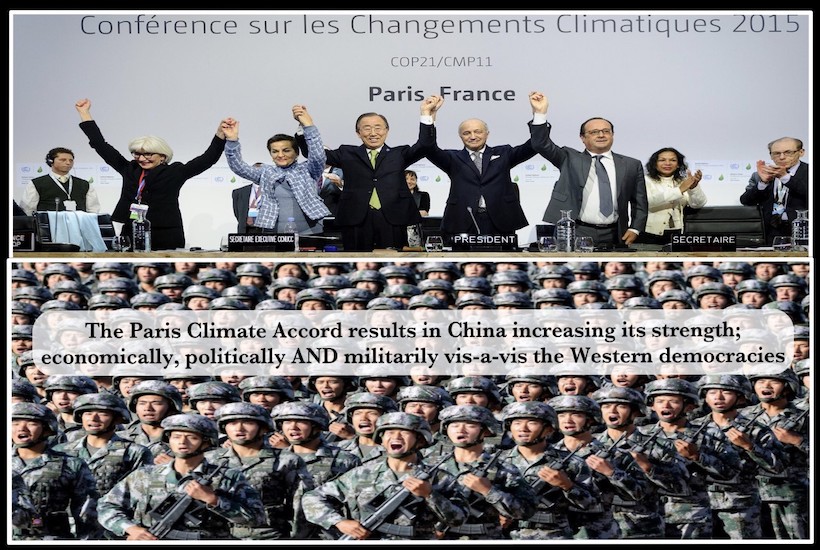 Simply, the terms of the Paris Climate Accord result in China increasing its strength; economically, politically and militarily vis-à-vis the Western democracies.
