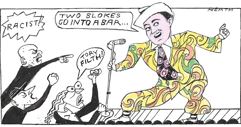 I’m watching television more uncritically than usual but still can’t stomach the format of Live at the Apollo. It features some clever comedians, but its artificiality, cutting to the audience to show canned hilarity — or worse, canned celebrity hilarity; or worse still, genuine hilarity — is a turn-off. It’s not the comedians’ fault that producers choose to show people helpless with laughter at a not very amusing joke, but the practice alienates you from their material. If that shower thinks they’re funny then they can’t be. We laugh too easily today. Laughter used to be like virtue. It wasn’t something we were willing to give away on a first date. Now we’re anybody’s. And yet, simultaneous with this great homogenising of laughter, comes the latest wave of offence-taking, washing away the transgressive constituent from comedy which as often as not is the best part of it. In the end, maybe the two phenomena are closely related. We laugh together to show we are united, that no offence can possibly be given, or taken, if the mirth that shakes you is the mirth that shakes me. Which makes the world half as funny as it was. And soon not funny at all.