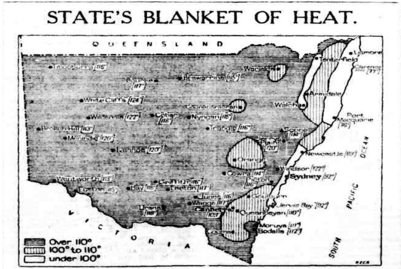 On January 13, 1939, The Sydney Morning Herald reported: ‘Based on officially recorded maximum temperatures ….. the registration of 124 degrees (51.1°C) at White Cliffs was the highest recorded in New South Wales since the record for the State, 125 degrees (51.7°C) was made at Bourke in 1909’.