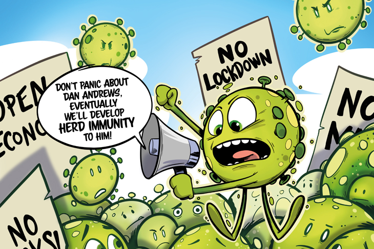 Seemingly ignorant of all this, Daniel Andrews thinks he can eradicate coronavirus but, like the Hellespont, it won’t do what people tell it to. Unable to locate the microscopic virus and unable to explain how shutting down the economy will stop it spreading, Andrews is instead punishing the people of Victoria by taking their freedoms and destroying their livelihoods. Sadly, we have no Artabanus in Australia. The clearest warning came from a professor of epidemiology at the University of Oxford, Sunetra Gupta. In early July, she called Australia’s approach ‘selfish’ and ‘self-congratulatory’, going on to say that ‘there is no way lockdown can eliminate the virus’. A cursory glance at the coronavirus figures around the world will show that there is no correlation between house arrest, shop closures, and a reduced spread of the disease. So why does Andrews continue to implement failed policies?