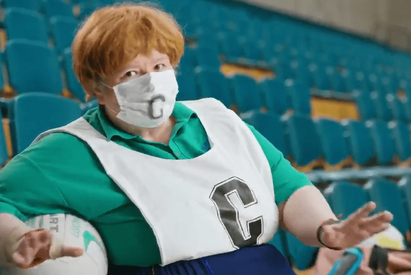 The ad, which is about as funny as being fined by police for visiting your mum on Mother’s Day, shows Sharon playing a game of netball against herself.
