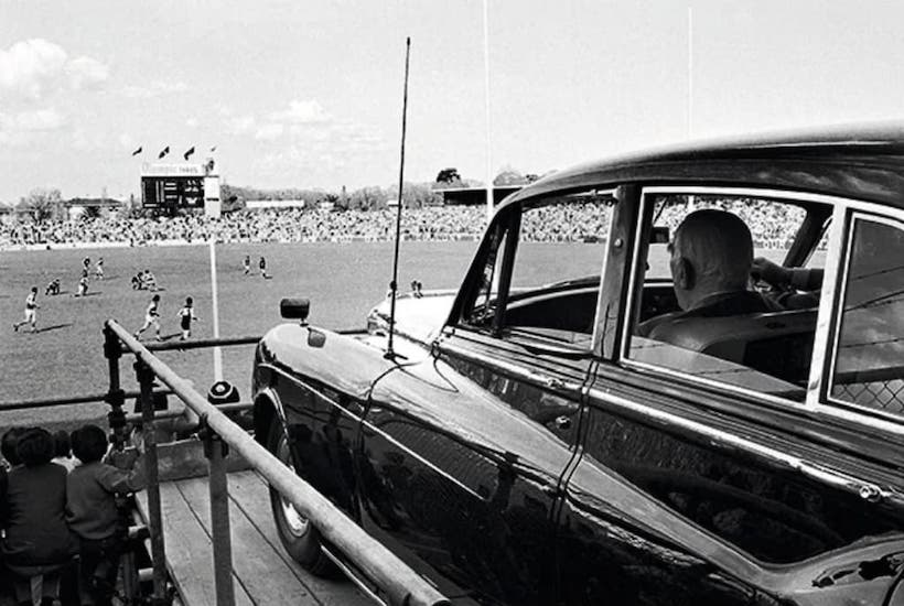 Woke Note: Bob Menzies’ prime ministerial Bentley — seen here on the special platform he used at Princes Park so he could watch his beloved Blues play from the vehicle — was black. Woke before his time? It was Gough Whitlam who switched to a white car, a Mercedes Benz 450SL.