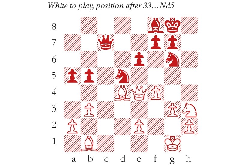1 c4 c5 2 b3 b6 3 Ngf3 Nef6 4 d4 e6 5 O-O Castling rules are adapted in Chess960: move Kf1 to g1 and Rh1 to f1. 5…Ne7 6 Qd2 Ng6 7 Nd3 Qe7 8 Rfd1 cxd4 9 Nxd4 O-O Move Kf8 to g8 and Rh8 to f8. 10 Qb4 Bd6 11 Qc3 Rfe8 12 Nb5 Bb8 13 Qb4? d6? 13…Bxh2+! initiates a winning attack. 14 f3 a6 15 Nd4 a5 16 Qe1 d5 17 cxd5 Nxd5 18 Rxc8 Rxc8 19 Rc1 Rd8 20 Nc6 Bxc6 21 Rxc6 Qg5 22 g3 h5 23 Qc1 Qe7 24 Rc8 h4 25 f4 Bd6 26 Qc6 Qf8 27 Rxd8 Qxd8 28 Qc4 Bf8 29 Bd4 h3 30 Nf2 b5 31 Qd3 Nb4 32 Qe4 Qc7 33 Nxh3 Nd5 (see diagram) 34 Qd3? Bc5 35 Qc2?? Bxd4+ White resigns