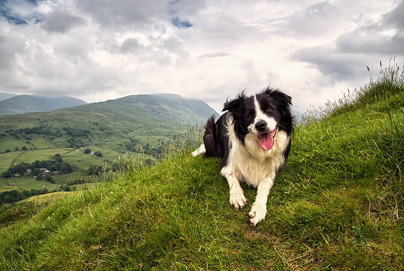 And whistles his collie to heel,