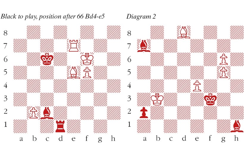 Evidently the pawn on g6 is White’s main source of aspiration, though the Black pawn on a2 requires urgent attention. 1 Kxa2 might strike you as suspiciously simple in a composed problem, and indeed it meets with a subtle defence: 1… Kxe4 2 g7 Kd4! prepares a check on d5. After 3 Bf6+ Kc5 4 g8=Q Bd5+ 5 Qxd5 Kxd5 6 g6 Ke6 Black’s king can arrest the second g-pawn. But 1 Bf6! is more promising: with both Black bishops sidelined, it is hard to prevent the advance of the g6-pawn. Resourceful play from both sides is the hallmark of a good endgame study, so to get to the bottom of this you must find 1…a1=Q! 2 Bxa1 Bd4! 3 Bxd4 Kxe4. Now, pressing on with 4 g7 Kxd4 5 g8=Q Bd5+ leads to a draw, while 4 Kc3 Kf5 5 g7 Bd5 also saves the game. White must guard the d5 square, hence 4 Kc4! That looks decisive, but there is one more trick to contend with. 4…Bf3! 5 g7 Bh5! sets up a check on f7, and we are at the climax: White wins with the underpromotion 6 g8=B!, when the extra bishop and pawn win the endgame comfortably. Why the underpromotion? Black’s devious defence reveals itself after 6 g8=Q Bf7+! 7 Qxf7 stalemate. This presented itself like a little wink from the universe. Rotating the board and ignoring the trivial differences, we see an unmistakeable doppelgänger for Dubov’s ploy.
