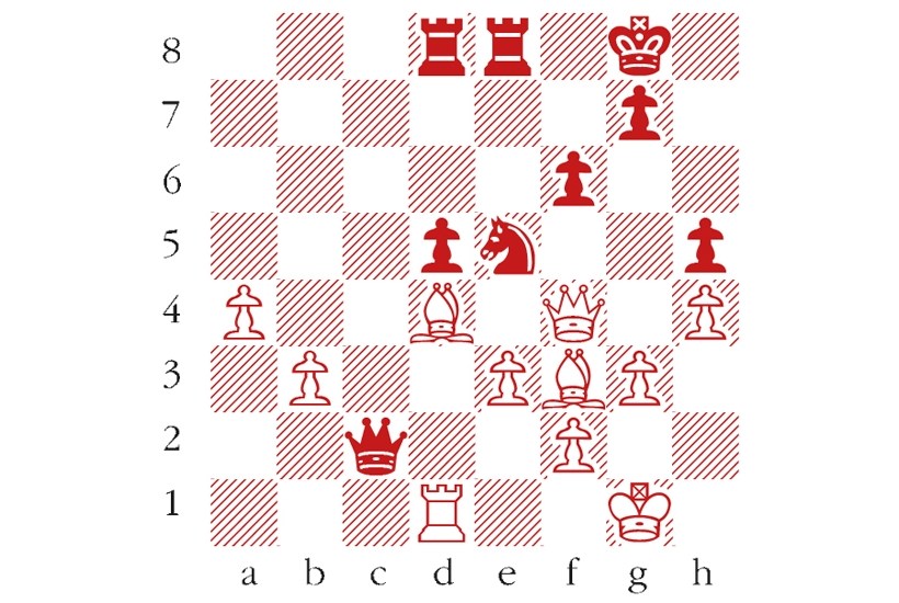 Black to play. Praggnanandhaa–Salimova, April 2021. White’s last move, Bg2-f3, was a blunder. Which move should Black play to exploit it? Email answers to chess@spectator.co.uk by Monday 26 April. There is a prize of £20 for the first correct answer out of a hat. Please include a postal address and allow six weeks for prize delivery.