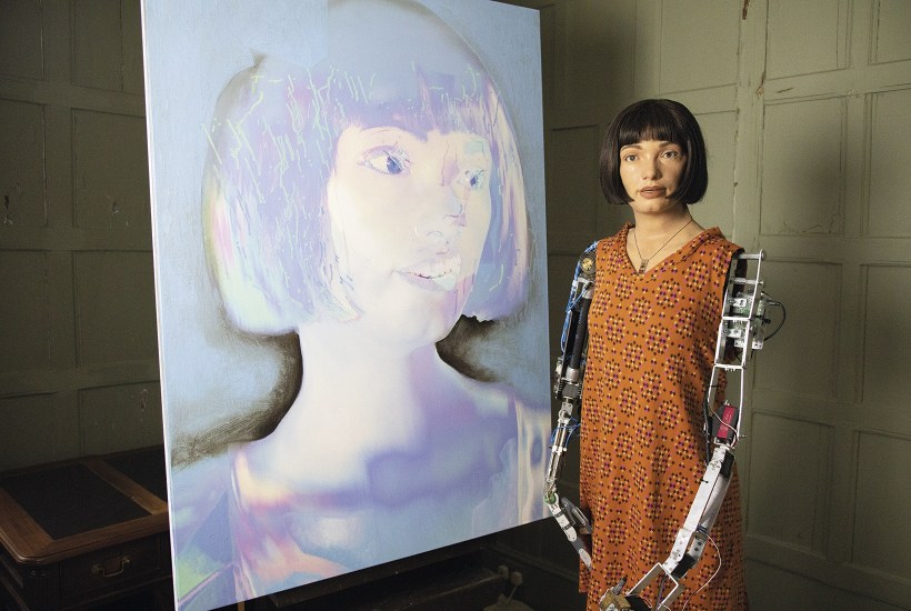 Meller’s idea with Ai-Da is that you can’t tell whether you’re addressing a human or a machine. Nor are visitors likely to be able to distinguish the human brush strokes from the mechanical ones that made her self-portraits. To create her self-portraits, Ai-Da made sketches after looking at herself in the mirror through her camera eyes. Co-ordinates from the sketches were digitally manipulated into algorithms that produced images, which were then rendered in paint both by Ai-Da’s brush and by an art technician. What a fuss! She could have just used an iPad like David Hockney. ‘The manner in which they are constructed, using a blend of machine and human creativity, manifests the fractured nature of postmodern identity,’ announces the blurb next to her pictures, which may have been written by a human, but reads as if it were generated by algorithms.