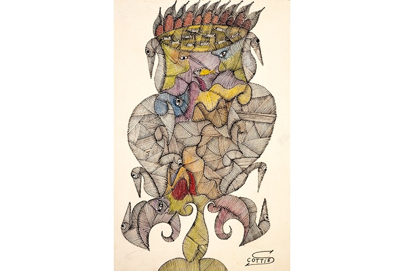 The pen was part of the Scottie myth. And how Scottie liked a myth. Never the same story to the same person twice, never a checkable name or a date. The pen, thought Scottie, looked a lot like a bulldog. You can see it on the Tate website: a stocky, wide-barrelled thing. The Bulldog lived on a card table at the back of Scottie’s Toronto schmutter shop. The baize on the tabletop was worn out and covered over with cardboard. It was 1932 (or thereabouts) and Scottie was 44 (or so). One morning, or afternoon, or evening, with the radio playing a Mendelssohn concert, Scottie began to draw. He could not stop. He did not stop for 40 years, not until his death in 1972. He covered the table, he covered the walls. He drew suns, trees, birds, flowers and orchids unknown to taxonomy. He created his own heraldic devices: beaks and petals, spines and eyes. He called his creatures ‘greedies and evils’ and set down their bizarre physiognomy in thousands of closely hatched strokes. He invented freely and recorded minutely. His work doesn’t spring from the imagination so much as crawl out from under the bed. ‘Don’t ask me what they mean,’ he used to say. ‘If you don’t know I can’t tell you.’ He never gave his pictures titles and preferred drawing pins to proper frames.