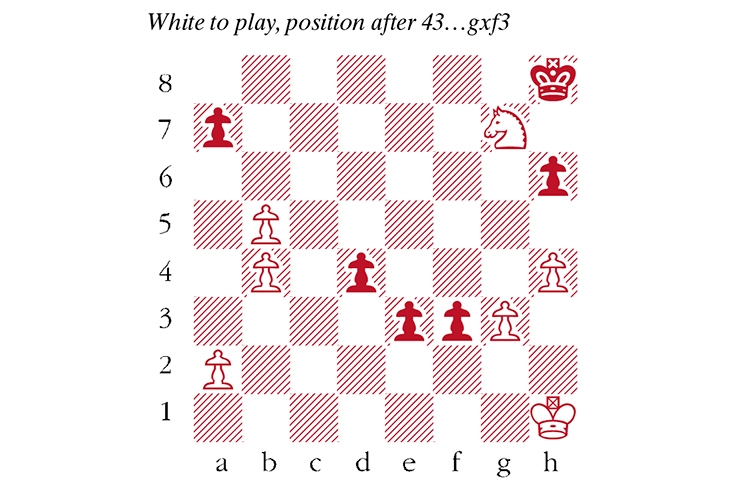 1 e4 d6 2 d4 g6 3 c4 Bg7 4 f4 Nf6 5 Nc3 O-O 6 Nf3 Nowadays, this is known as the ‘Four pawns attack’ variation of the King’s Indian defence. 6…c6 7 Bd3 e5 A good time to strike. The only way for White to win a pawn is with 8 dxe5 dxe5 9 Nxe5, but then Na6 promises Black active play. 8 fxe5 dxe5 9 d5 b5! An excellent dynamic thrust. 10 Bg5 h6 11 Bxf6 Bxf6 12 cxb5 cxd5 13 Nxd5 Bg7 14 Bc4 Nd7 15 O-O Bb7 16 Kh1 Nc5 Despite White’s extra pawn, Black’s bishop pair and safer king promise long-term counterchances. White’s next move is a mistake, as the rook belonged on the open f-file. 17 Re1 Rc8 18 b4 Ne6 19 Bb3 Kh7 20 Rc1 Rxc1 21 Qxc1 Qd7 22 Qe3 Nd4 23 Nxd4 exd4 24 Qd3 f5 25 Qh3 Re8 26 Qh4 g5 27 Qf2 Kh8 28 h4 Rxe4 29 Rxe4 fxe4 30 Nf6 Qc7 Instead, 30…e3! gives Black a decisive advantage, but now White has an amazing resource. 31 Nh5 31 Qf5! Qc1+ 32 Bd1!! Qxd1 33 Kh2 Bxf6 34 Qxf6+ is drawn by perpetual check. Qc1+ 32 Kh2 Qc7+ 33 g3 e3 34 Qf5 Qc1 35 Bd5 Bxd5 36 Qxd5 Qc2+ 37 Kh3 Qg6 38 Nxg7 g4+ 39 Kh2 Qc2+ 40 Kh1 40 Qg2!! was an unlikely saving opportunity. After 40…d3 41 Nf5 e2 42 Qa8+! Kh7 43 Nd4! White can draw amid fantastic complications. But not 42 Nd4? e1=N!! 43 Qxc2 Nxc2 and Black soon wins. 40…Qd1+ 41 Kg2 Qe2+ 42 Kh1 42 Kg1 Qf2+ comes to the same thing. Qf3+ 43 Qxf3 gxf3 (see diagram) 44 Kg1 d3 45 Nf5 e2 46 Kf2 White resigns before d3-d2 arrives.