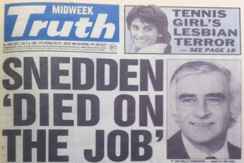 Alas, though, Sir Billy, as he became, is even better-known for the Truth headline that followed his departure from this mortal coil, “Snedden ‘died on the job'”.