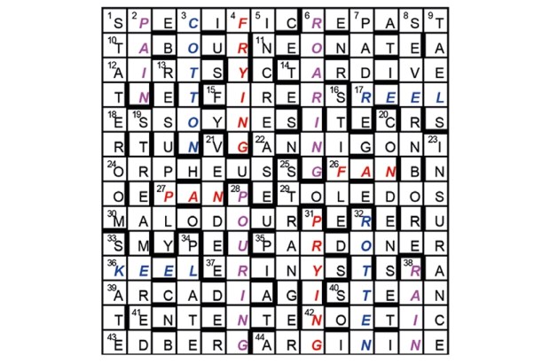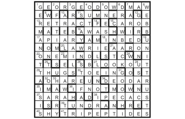 A first prize of £30 for the first correct solution opened on 19 July. There are two runners-up prizes of £20. Please scan or photograph entries and email them (including the crossword number in the subject field) to crosswords@spectator.co.uk – the dictionary prize is not available. We will accept postal entries again at some point.