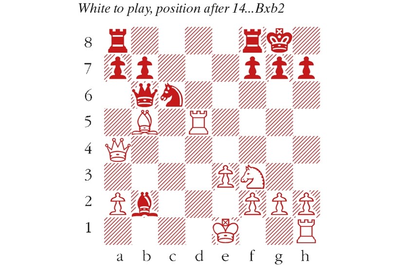 A pleasant opening for White, with pressure against the isolated queen’s pawn. Qb6 12 Bxf6 Bxf6 13 Nxd5 Bxd5 14 Rxd5 Bxb2 (see diagram) 15 Ke2! Bf6 16 Rhd1 Rac8 17 Bc4 Preparing to target the pawn on f7. Qb4 18 Qb3!