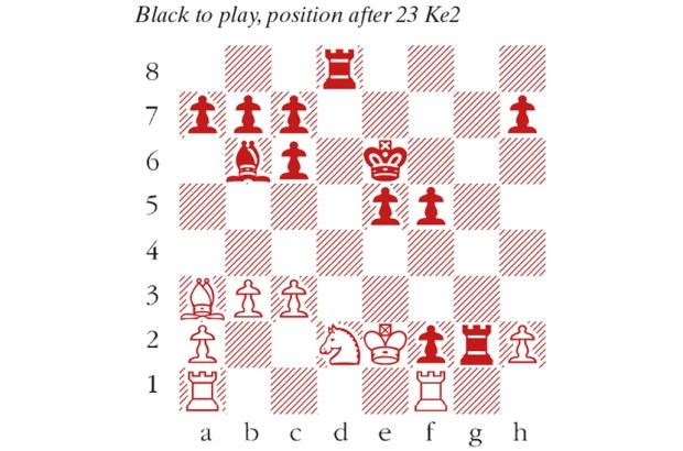 1 e4 c5 2 Nf3 Nc6 3 d4 cxd4 4 Nxd4 Nf6 5 Nc3 e5 The defining move of the Sveshnikov Sicilian. 6 Ndb5 d6 7 Bg5 a6 8 Bxf6 gxf6 9 Na3 b5 10 Nd5 f5 It was once thought that White’s proud knight on d5 and clean pawn structure promised a good game. These days, the merits of Black’s setup are better appreciated. The bishop pair is a great asset, and the scrappy mass of pawns should not be underestimated, while the Na3 has yet to rejoin the fray. 11 Bd3 Be6 12 c4 Qa5+ 13 Kf1 Bxd5 14 exd5 Nd4 15 cxb5 axb5 16 Nc2 Nxc2 17 Qxc2 e4 18 Qc6+ Ke7 19 Bxb5 Ra7 20 Qe8+ Kf6 21 g4 Re7 22 Qb8 Ke5 (see diagram) The most outlandish moves are often played for the simplest reasons. This one defends the d6-pawn, creating the unexpected threat of …Bf8-g7, trapping the White queen on b8. 23 f4+ Kxf4 24 Ke2 24 Qxd6+ Re5! 25 Qc6 Qd2 and Black maintains some initiative. 24 Be2 was better, preparing Qb8-b3. Ke5 As simple as that! The king is safe now. 25 Rhf1 fxg4 26 b4 Laying a trap, since 26…Qxb4 27 Rf5+ Kxf5 28 Bd7+ wins. Bg7 27 bxa5 27 Qxh8 Qxb5+ wins, as White is in check! Rxb8 28 Rab1 f5 29 a6 f4 The a-pawn is easily restrained, but the tide of kingside pawns cannot be abated. 30 Bc6 f3+ 31 Kf2 Rxb1 32 Rxb1 Kf4 33 Rb4 Bc3 34 Rc4 Ba5 35 Kf1 Bb6 36 Bb7 h5 37 Rc6 e3 38 Rc4+ Kg5 White resigns