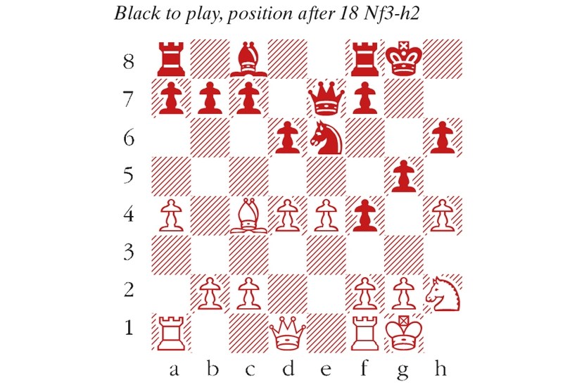 1 e4 e5 2 Nf3 Nc6 3 Bc4 Bc5 4 O-O Nf6 5 d3 O-O 6 Bg5 h6 7 Bh4 Be7 It’s worth redeploying this bishop to break the pin on the h4-d8 diagonal. 8 Bg3 d6 9 a4 Nh7 10 Nc3 Ng5 11 Nd2 Ne6 12 Nd5 Bg5 13 Nf3 Ne7 14 h4 Bf4 15 Bxf4 exf4 16 Nxe7+ Qxe7 17 d4 At first sight, White enjoys a simple advantage, with good central control. Things are not that easy! Radjabov’s next move looks extravagant, but aims to show that h2-h4 is a significant weakening of the kingside. g5! 18 Nh2 (see diagram) 18 hxg5 hxg5 19 Re1 was playable, but one idea to reckon with is 19…Kg7, angling for Rf8-h8 and an attack down the h-file. 18…gxh4! It is ghastly to behold the kingside pawn structure which results from this move. But the zombie horde has strength in numbers. Besides snatching a pawn, Radjabov has a simple plan to smash the door down on the open g-file. 19 Re1 Kh8 20 e5 Qg5 21 Nf3 Qg4 22 exd6 22 Kh2 was essential, though after 22…Rg8 23 Bf1 Ng5 Black is still having more fun. 22…h3 23 Bf1 hxg2 24 Be2 Shielding behind the attacker’s pawn is often viable, but it falls short here. 24…Ng5! Now if 25 Nxg5 Qh4! threatens mate on h1, and then 26 Kxg2 Qxg5+ is devastating. 25 d5 Qh5 White resigns, in view of 26 Nh2 Nh3+ 27 Kxg2 Rg8+.